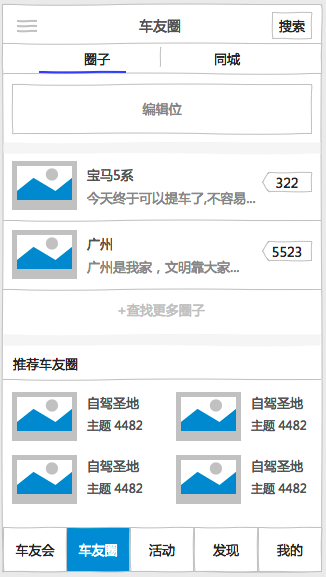 ①¸ù¾ÝÓû§ÔÚ³µÓÑ»áËùÌîµÄ³µÐͺ͵ØÇøÐÅÏ¢×Ô¶¯¸øÓû§¹Ø×¢1¸öµØÇøÈ¦×ÓºÍ1¸ö³µÐÍȦ×Ó¡£ÏÈÏÔʾµØÇøÈ¦×ÓÔÙÏÔʾ³µÏµÈ¦×Ó¡£ÈôÎÞÊý¾Ý£¬ÔòÌáʾÓû§×ÔÐÐÈ¥¼ÓÈëȦ×Ó¡£