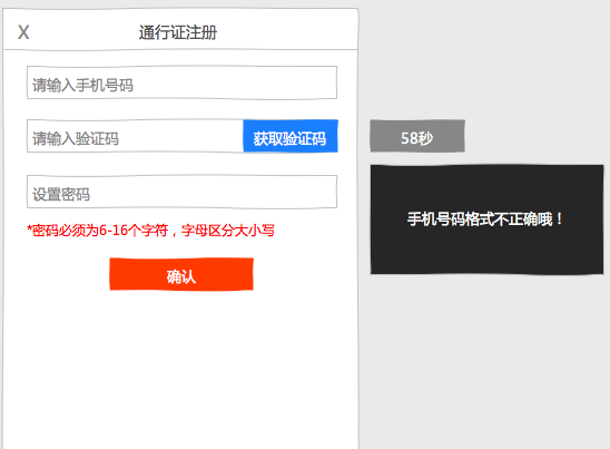 ①Ŀǰֻ֧³ÖÊÖ»ú×¢²áÕ˺ţ¬ÊäÈëÊÖ»úºÅÂëÖ®ºó£¬µã»÷“»ñÈ¡ÑéÖ¤Â딣¬°´Å¥Îݸ±äΪ“»ñÈ¡ÖÐ…”ÑéÖ¤ÊÖ»úºÅÂë¸ñʽÊÇ·ñÕýÈ·£¬Èç¹ûÕýÈ·£¬Ôò½«°´Å¥×´Ì¬½øÈë60Ãëµ¹¼ÆÊ±×´Ì¬£¬´Ë¼ä²»¿Éµã»÷£»Èç¹û²»ÕýÈ·£¬µ¯³ötoastÌáʾÓû§¡£ÑéÖ¤Âë²»ÕýÈ·ÌáʾÎݸΪ£ºÑéÖ¤ÂëÊäÈëÓÐÎó£¡ÈôÃÜÂë¹æÔòÓÐÎó£¬ÔòÔÚÃÜÂëÊäÈë¿òÏ·½ÏÔʾ´íÎóÌáʾ£ºÃÜÂë±ØÐëΪ6-16¸ö×Ö·û£¬×ÖÄ¸Çø·Ö´óСд¡£ÐÂÔöÈ·ÈÏÃÜÂëÌõÄ¿£¬ÑùʽÓëĬÈÏÎݸÏê¼ûÉè¼Æ¸å£¬±¨´íÎݸ£ºÁ½´ÎÊäÈëÃÜÂë²»Ò»ÖÂŶ¡£¡¾05ÔÂ18ÈÕ¡¿
