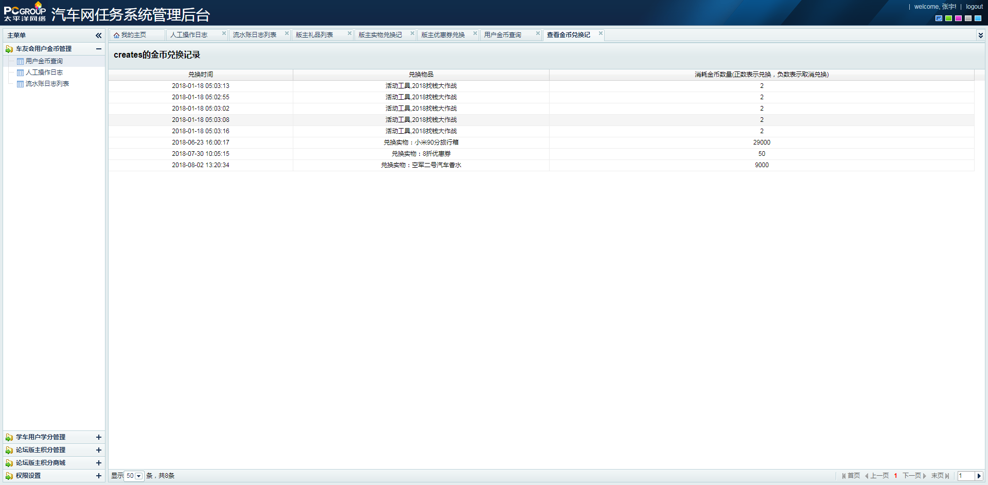 1.表格上方出:XX的羊币兑换记录;(XX=用户名);