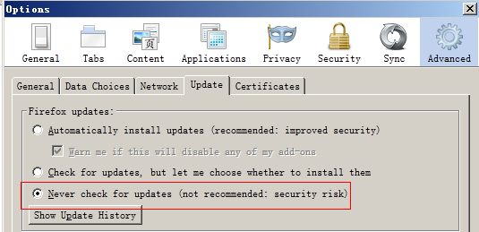 - 安装完成后,将浏览器默认的自动更新设置修改为 "Never check for updates",如下图:
